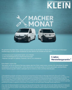 Während viele nur machen lassen, bist du die Person, die macht – Tag für Tag. Genau deshalb ist der Macher Monat zurück: Wir belohnen alle, die anpacken, aufbauen und abliefern, mit starken Konditionen – vom effizienten e‑Transporter bis zu weiteren Macher-Modellen. Egal ob du ein einzelnes Fahrzeug brauchst oder eine ganze Flotte planst: Die Aktion gilt exklusiv für Gewerbekunden bei teilnehmenden Volkswagen Nutzfahrzeuge Partnern.